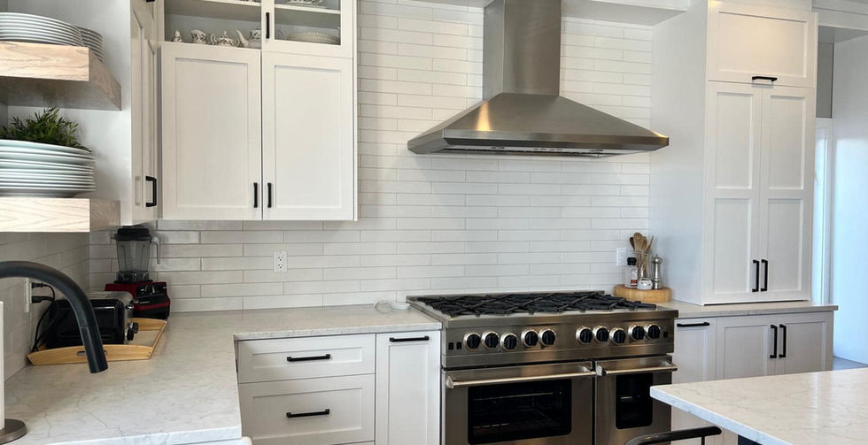 This kitchen features sleek, crisp white cupboards paired with a bold, custom blue island that makes a striking statement! The open shelves not only enhance the room’s airy feel but also offer the perfect space for showcasing plants, dinnerware or any decor of your choice. And how about that farmhouse sink - what a showstopper!!!